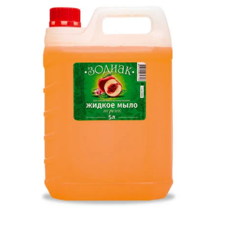 Зодиак жидкое мыло прозрачное персик 5 лМягкие щадящие компоненты, входящие в состав мыла позволяют бережно, не вызывая сухости, очистить кожу рук и тела. За счет повышенного пенообразования экономично в использовании.