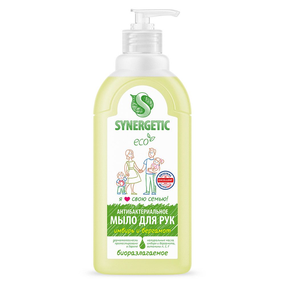 Synergetic жидкое антибактериальное мыло имбирь и бергамот 0,5 лАнтибактериальное увлажняющее жидкое мыло SYNERGETIC "Имбирь и бергамот" эффективно очищает кожу от любых загрязнений и запахов даже в холодной воде. Комбинация растительных К-тензидов, морской соли и натуральных эфирных масел имбиря, бергамота, чайного дерева, тимьяна и мелиссы обеспечивает длительный антибактериальный эффект с защитой от микроорганизмов на 99,9%. Растительный глицерин обеспечивает интенсивное увлажнение кожи. Комплекс витаминов, E, повышает сопротивляемость кожи неблагоприятному воздействию внешней среды. Мультифункциональный компонент натурального происхождения софоролипид мягко очищает и сохраняет естественный микробиом кожи. Гипоаллергенное средство подходит для чувствительной кожи. Мыло дерматологически протестировано независимым исследовательским институтом ®️ в Германии. Биоразлагаемые компоненты безопасны для природы и человека и не вредят микрофлоре септических установок при использовании средства в соответствии со способом применени