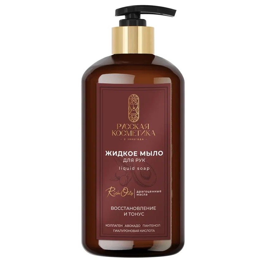 Русская Косметика жидкое мыло для рук восстановление и тонус 600 млЖидкое мыло с активным комплексом коллагена и гиалуроновой кислотой - это драгоценный эликсир для молодости и красоты кожи рук. Мыло эффективно и бережно очищает и освежает кожу, оставляя на ней шлейф благородного аромата. Масло авокадо и пантенол смягчает, питает и тонизирует кожу. Подходит для ежедневного применения.