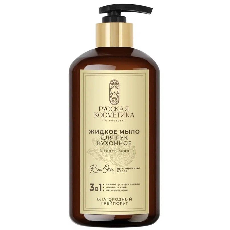 Русская Косметика жидкое мыло для рук кухонное благородный грейпфрут 600 млЖидкое мыло для рук с купажом цитрусовых экстрактов, маслом грейпфрута и д-пантенолом в составе - это незаменимое уходовое средство на Вашей кухне. Мягкая текстура средства легко справляется с загрязнениями даже в холодной воде, а специально разработанный состав позаботится о красоте и молодости Ваших рук. Мыло интенсивно восстанавливает и питает кожу, смягчает и защищает от сухости. Нежная формула мыла эффективно нейтрализует неприятные запахи, полностью смывается водой и подарит наслаждение ароматом благородного грейпфрута.