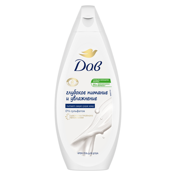 Дав гель для душа глубокое питание и увлажнение 250 млУхоженная и увлажненная кожа сразу после душа? Да! С крем-гелем Глубокое питание и увлажнение от Dove. Увлажняющая формула с сывороткой тройного увлажнения глубоко**** питает даже самую сухую кожу. Содержит очищающие компоненты из природного сырья и увлажняющий компонент растительного происхождения. 0% сульфатов SLES (содиум лаурет сульфат). Гель для душа Dove создает пышную пену и бережно очищает кожу. Крем-гель обладает роскошным уходовым ароматом, благодаря которому обычный прием душа станет небольшим спа-ритуалом и временем, посвященным себе и своей красоте. Результат: мягкая, увлажненная кожа за 1 применение.