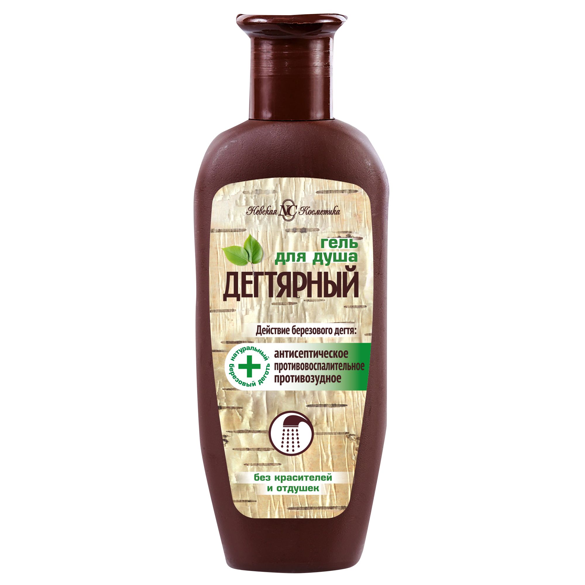 Невская Косметика гель для душа дегтярный 250 млПредназначен для ежедневного очищения кожи тела. Бережно очищает кожу, не вызывая сухости и раздражения. Натуральный березовый деготь — обладает сильным восстанавливающим, антисептическим, противопаразитарным, подсушивающим, противовоспалительным, успокаивающим действием.