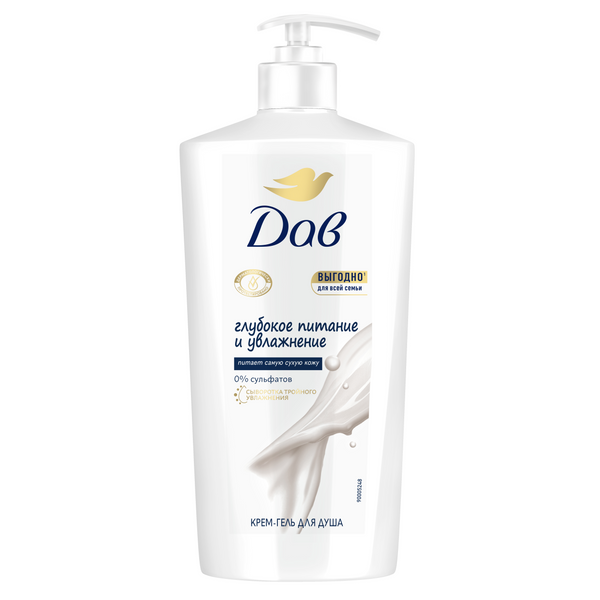 Дав гель для душа глубокое питание и увлажнение 610 млКрем-гель для душа Глубокое питание и увлажнение от Dove на основе увлажняющей формулы с сывороткой тройного увлажнения глубоко*** и бережно очищает и питает даже самую сухую кожу. Содержит очищающие компоненты из природного сырья и увлажняющий компонент растительного происхождения. 0% сульфатов SLES (содиум лаурет сульфат). Подходит для всей семьи, в том числе детей с 4-х лет. Гель для душа Dove создает гигантское облако пены всего от одной капли и бережно очищает кожу.
