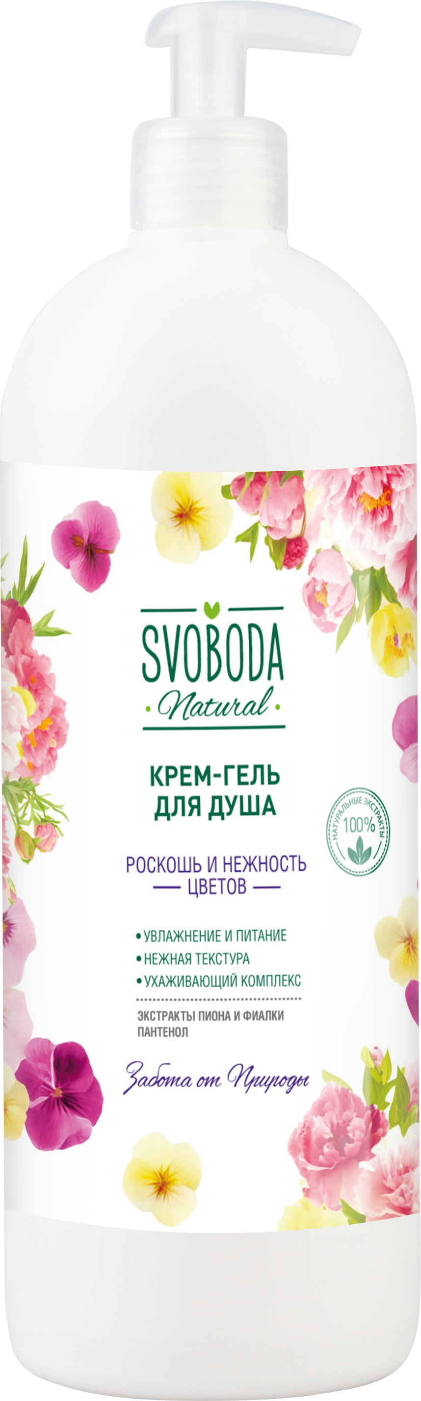 Svoboda крем гель для душа роскошь и нежность цветов 1000 млНежная кремовая текстура и завораживающий цветочный аромат крем-геля для душа превращают ежедневное очищение кожи в наслаждение. Крем-гель содержит пантенол, экстракт фиалки, экстракт пиона, экстракт шиповника и инновационную высокоэффективную добавку с глубоким ухаживающим действием. Эти ценные компоненты заботятся о коже, обеспечивают деликатное очищение, питание и увлажнение, помогая сохранить красоту кожи. Не содержит парабенов и силиконов.
