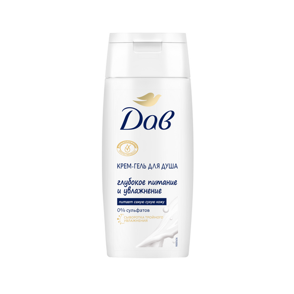 Дав гель для душа глубокое питание и увлажнение 100 млПопробуйте крем-гель для душа Глубокое питание и увлажнение в тревел-формате 100 мл. Увлажняющая формула с сывороткой тройного увлажнения в его составе глубоко* и бережно очищает и питает даже самую сухую кожу. • В составе очищающие компоненты из природного сырья и увлажняющий компонент растительного происхождения. • 0% сульфатов (содиум лаурет сульфат). • Подходит для всей семьи, в том числе детей с 4-х лет. • Гель для душа создает гигантское облако пены всего от одной капли и бережно очищает кожу. • Крем-гель обладает роскошным уходовым ароматом, благодаря которому обычный прием душа станет небольшим спа-ритуалом и временем, посвященным себе и своей красоте. Результат: мягкая, увлажненная кожа за 1 применение***.