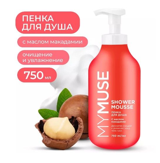 My Muse пенка для душа с маслом макадамии и экстрактом черного перца 750 млMY MUSE Пенка для душа с маслом макадамии и экстрактом черного перца 750 мл - пенка для душа с бархатной текстурой и нежным ароматом, созданная на основе высококачественных компонентов, обеспечивает деликатный уход за кожей.
