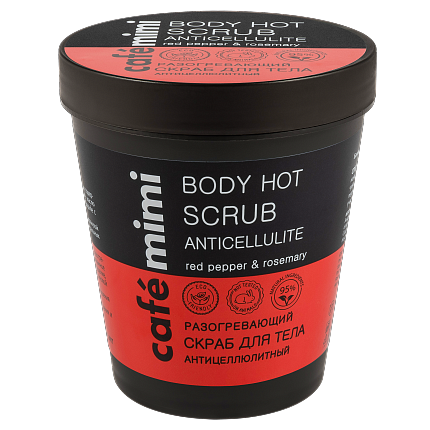 Скраб для тела с разогревающим эффектом содержит экстракт красного перца и эфирное масло розмарина - незаменимый помощник в борьбе с целлюлитом.Кожа выглядит заметно более гладкой и подтянутой за счёт эффективного действия натуральных активных ингредиентов: