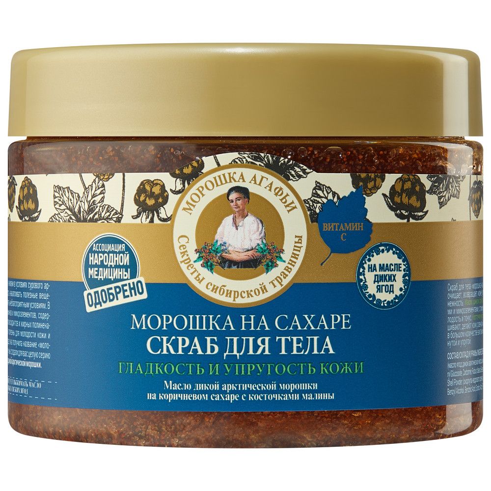 Рецепты Бабушки Агафьи скраб для тела морошка на сахаре 300 млСкраб для тела «морошка на сахаре» на основе масла диких ягод бережно очищает, возвращает коже упругость и эластичность, придает гладкость и нежность. Масло дикой арктической морошки, обогащенное антиоксидантами и микроэлементами, стимулирует обновление клеток, придавая коже молодость и тонус. Косточки малины и коричневый сахар эффективно отшелушивают, делают кожу ровной и гладкой. Сок сибирского барбариса содержит в большом количестве витамин С и А.Н.А.-кислоты, делает кожу более подтянутой и упругой.