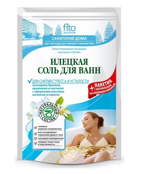 Натуральная илецкая соль с раслабляющим комплексом – это самая популярная санаторная процедура в Вашей ванне. Насыщенная бромом, кремнием и магнием Илецкая соль с натуральными эфирными маслами жасмина и нероли насыщает кожу полезными минералами, придает ей упругость и эластичность. Мгновенно снимает нервное напряжение и усталость, окутывает чувственным, нежным ароматом цветущего сада, дарит полноценный отдых и позволяет полностью забыть о проблемах. Натуральный расслабляющий комплекс благотворно влияет на состояние нервной системы, устраняет депрессию, бессонницу и тревогу, возвращает радость жизни и прекрасное настроение. Всего 15-20 минут приятного расслабления и Вы снова полны энергии, силы и бодрости, как будто только что приехали с морского побережья.Состав соли: Maris Sal Состав Натурального расслабляющего комплекса: Aqua, Glycerin, PEG-40 Hydrogenated Castor Oil, Cocamidopropyl Betaine, Panthenol, Propylene Glycol, Pearl Powder, Jasmine Еssential Оil (эфирное масло жасмина), Citrus Aurantium (Neroli) Еssential Oil (эфирное масло нероли), Chamomilla Recutita (Matricaria) Flower/Leaf Extract (экстракт ромашки), Maris Sal (соль Мертвого моря), Parfum, Glycine Soja (Soybean) Oil (масло сои), Methylchloroisothiazolinone, Methylisothiazolinone, Potassium Sorbate, CI 42090.