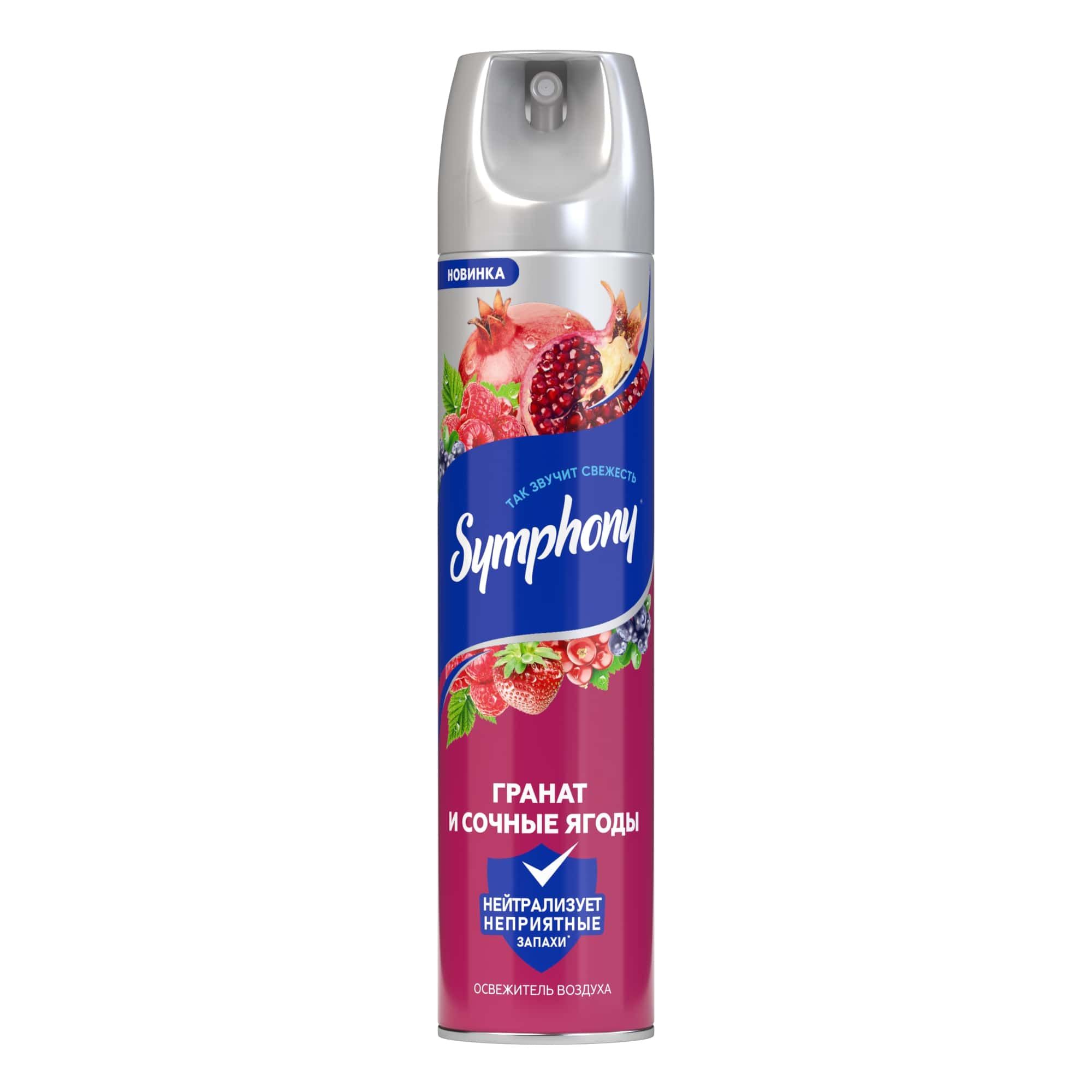 Symphony освежитель воздуха гранат и сочные ягоды 300 млОсвежитель воздуха "Symphony" создан для устранения неприятных запахов, освежения и ароматизации воздуха в жилых и бытовых помещениях, ванных и туалетных комнатах, помещениях для курения.