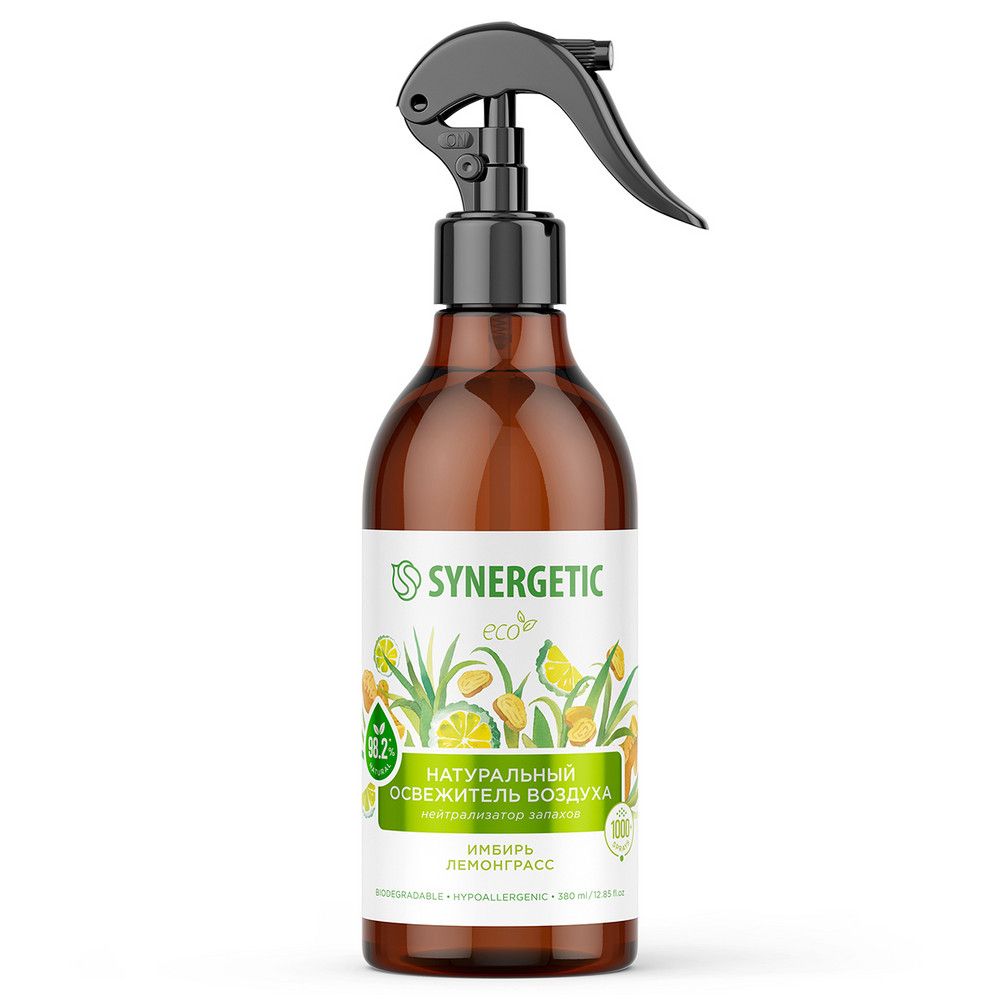 Synergetic освежитель воздуха имбирь и лемонграсс 380 млБиоразлагаемый освежитель воздуха, нейтрализатор запахов SYNERGETIC "Имбирь и лемонграсс" на водной основе - это безопасная формула с высокой концентрацией натуральных компонентов. Парфюмерная композиция с эфирными маслами имбиря, бергамота и лемонграсса наполняет воздух ярким цитрусовым ароматом. Гипоаллергенная формула безопасна для людей и животных. Благодаря натуральному поглотителю запахов - соли полиитаконовой кислоты - освежитель эффективно устраняет, а не маскирует стойкие запахи от приготовления пищи, домашних животных, табака и других источников неприятных запахов в гостиной, ванной комнате и санузле, спальне, коридоре, кухне, автомобиле, офисе и прочих помещениях. Подходит для устранения неприятных запахов с тканей (диванов, подушек, ковров, занавесок, простыней, тканевых автокресел, постельного белья), занавесок для душа и спортивных ковриков. Не оставляет следов на поверхностях, увлажняет воздух в помещении и способствует осаждению пыли. Не содержит парабенов, фреонов, газов-пропеллентов, фталатов и красителей. Мелкодисперсное распыление позволяет обеспечить экономичный расход средства.