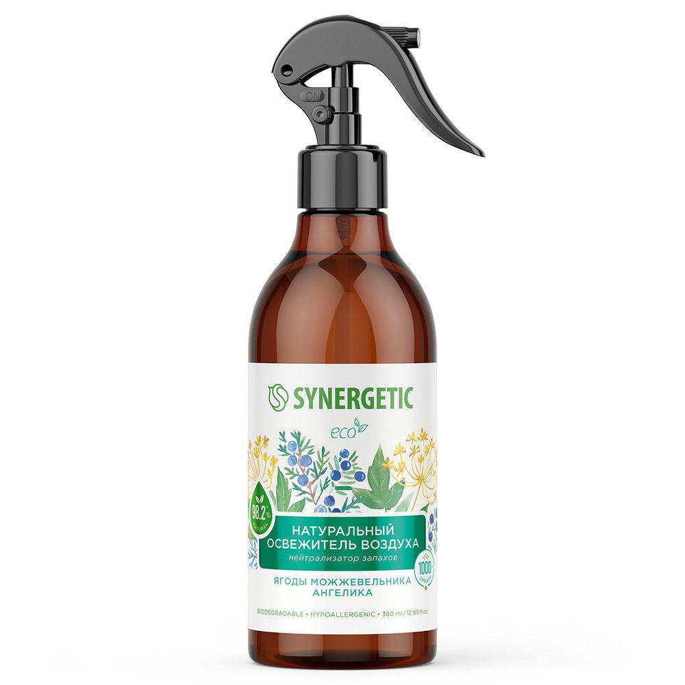 Synergetic освежитель воздуха ягоды можжевельника и ангелика 380 млБиоразлагаемый освежитель воздуха, нейтрализатор запахов SYNERGETIC "Ягоды можжевельника и ангелика" на водной основе - это безопасная формула с высокой концентрацией натуральных компонентов. Парфюмерная композиция с эфирными маслами сосны, ягод можжевельника и эвкалипта наполняет воздух свежим хвойным ароматом. Гипоаллергенная формула безопасна для людей и животных. Благодаря натуральному поглотителю запахов - соли полиитаконовой кислоты - освежитель эффективно устраняет, а не маскирует стойкие запахи от приготовления пищи, домашних животных, табака и других источников неприятных запахов в гостиной, ванной комнате и санузле, спальне, коридоре, кухне, автомобиле, офисе и прочих помещениях. Подходит для устранения неприятных запахов с тканей (диванов, подушек, ковров, занавесок, простыней, тканевых автокресел, постельного белья), занавесок для душа и спортивных ковриков. Не оставляет следов на поверхностях, увлажняет воздух в помещении и способствует осаждению пыли. Не содержит парабенов, фреонов, газов-пропеллентов, фталатов и красителей. Мелкодисперсное распыление позволяет обеспечить экономичный расход средства.