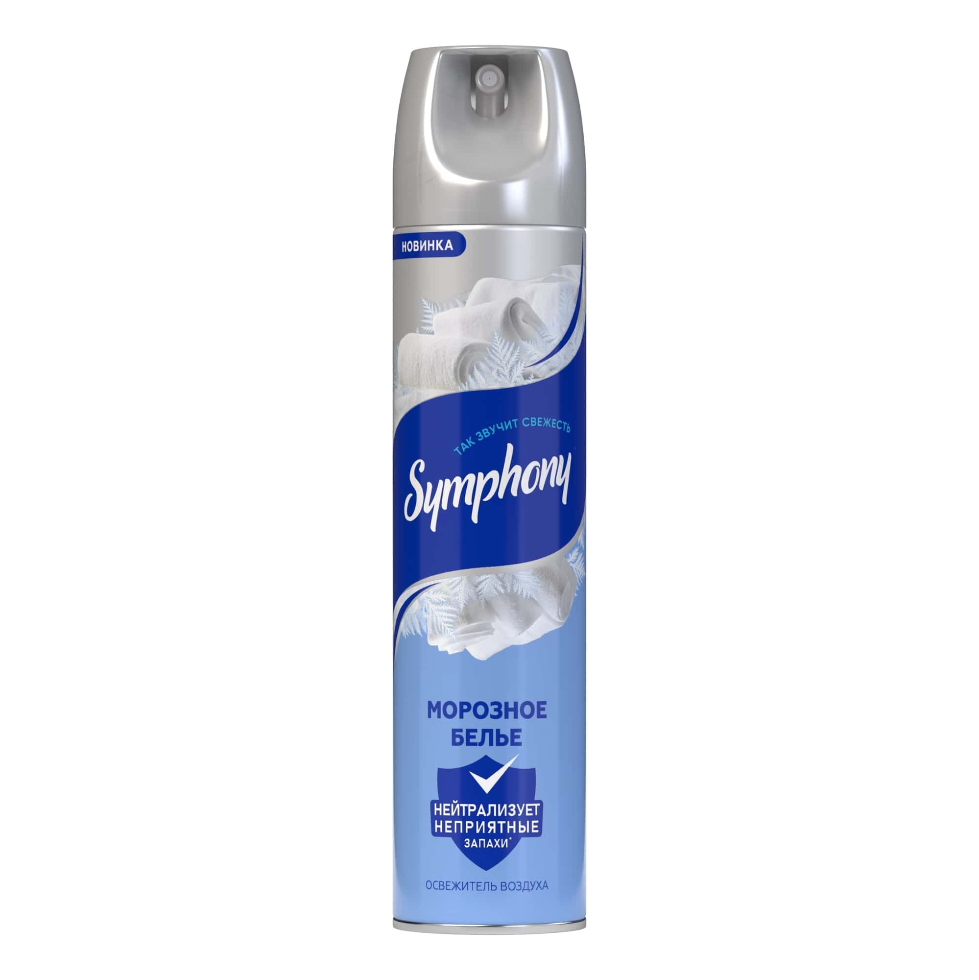 Symphony освежитель воздуха морозное белье 300 млОсвежитель воздуха "Symphony" создан для устранения неприятных запахов, освежения и ароматизации воздуха в жилых и бытовых помещениях, ванных и туалетных комнатах, помещениях для курения.