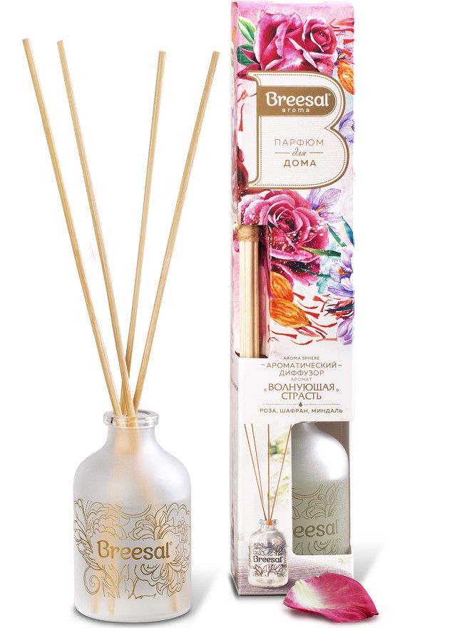 Breesal ароматический диффузор aroma sphere волнующая страсть 40 млДиффузор ароматический для дома Breesal – это многогранный аромат в стеклянном флаконе с натуральными древесными палочками, который впишется в любой интерьер и создаст в нем особую атмосферу. Завораживающая и чарующая композиция «Волнующая страсть» позволит на время скрыться от привычной жизни за манящей вуалью из нот розы, шафрана и миндаля и перенестись туда, где счастье ощущаешься каждой клеточкой тела. Просто откройте флакон и опустите палочки в ароматический диффузор для дома. Сделанные из натурального ротанга, они быстро наполнятся жидкостью и будут отдавать аромат медленно и равномерно, поэтому вы сможете наслаждаться им до 30 дней. Регулировать интенсивность ароматизатора для дома можно добавлением или уменьшением количества палочек. А если аромат станет менее ощутим, достаточно перевернуть палочки во флаконе аромадиффузора. Попробуйте и другие ароматы для дома от Breesal: в линейке ароматических диффузоров с палочками Aroma Sphere представлены четыре уникальные ароматические композиции с разным характером и настроением, чтобы каждый смог найти подходящий именно ему.