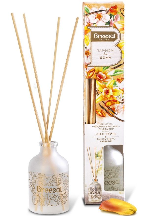 Breesal ароматический диффузор aroma sphere 1001 ночь 40 млДиффузор ароматический для дома Breesal – это многогранный аромат в стеклянном флаконе, который впишется в любой интерьер и создаст в нем особую атмосферу. Чувственная и волнующая композиция «1001 ночь» перенесет вас в восточную сказку: ваниль укутает в сладкую невесомую вуаль, амбра подарит тепло, а ноты лабданума соткут пряную и терпкую завесу тайны. Просто откройте флакон и опустите палочки в ароматический диффузор для дома. Сделанные из натурального ротанга, они быстро наполнятся жидкостью и будут отдавать аромат медленно и равномерно, поэтому вы сможете наслаждаться им до 30 дней. Регулировать интенсивность ароматизатора для дома можно добавлением или уменьшением количества палочек. А если аромат станет менее ощутим, достаточно перевернуть палочки во флаконе. Попробуйте и другие ароматы для дома от Breesal: в линейке ароматических диффузоров с палочками Aroma Sphere представлены четыре уникальные ароматические композиции с разным характером и настроением, чтобы каждый смог найти подходящий именно ему.
