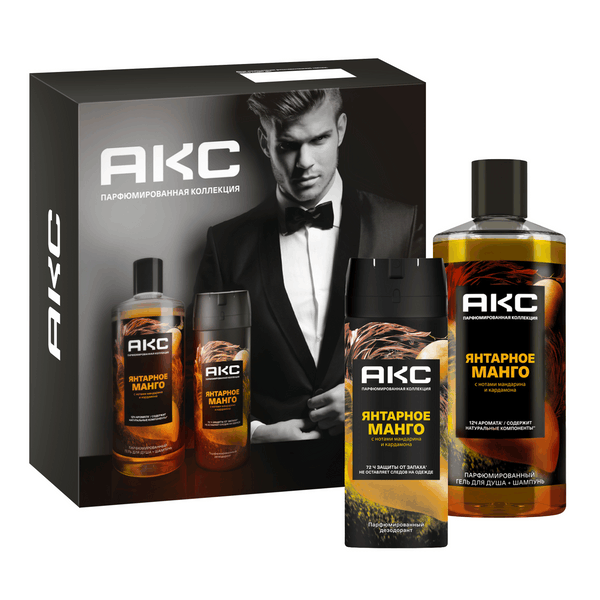 ПН Акс янтарное манго men дезодорант спрей 150 мл гель для душа и шампунь 400 млПодарочный набор мужчине АКС Янтарное манго представляет собой яркую коллекцию средств для ежедневного ухода за волосами и телом у мужчин. В состав набора входят гель для душа и шампунь для волос 2в1, дезодорант мужской спрей от запаха пота подмышек – незаменимые средства для тех, кто ценит высокий уровень ухода за собой и стремится к комфорту во всем. Средства упакованы в элегантную подарочную коробку, что делает этот комплект идеальным подарком. Гель для душа и шампунь для волос мужской 2в1 содержит в своем составе натуральные компоненты'. Его яркий аромат сохраняется на коже до 12 часов''. Уходовый гель для душа и шампунь для волос парфюмированный дарит волосам и коже оптимальный уход, бережно очищает их и ухаживает за ними. Дезодорант мужской спрей обеспечивает надежную защиту от запаха пота на протяжении 72 часов''', не оставляет белых следов и желтых пятен на одежде, обусловленных наличием солей алюминия. Дезодорант мужской парфюмированный не содержит солей алюминия, обеспечивает мягкий уход коже подмышек и эффективную защиту от запаха пота. Гель для душа и шампунь для волос 2в1, дезодорант мужской спрей обладают 100% топовым* ароматом от бренда АКС, который создан вместе с известным парфюмерным домом. Янтарное манго – дерзкий фруктово-древесный аромат, в котором легкомысленная сладость тропических фруктов уравновешивается травянистыми и древесными нотами.