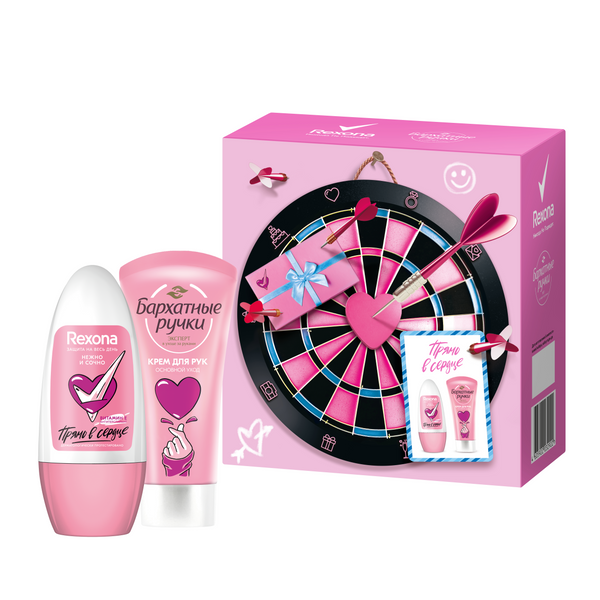 Rexona+бр прямо в сердце 2024 део-шарик 50 мл+крем для рук 45 млИдеальный презент для юных красоток, который пригодится на каждый день – подарочный набор Прямо в сердце от брендов Rexona и Бархатные ручки! Стильная упаковка в розовом цвете и яркие ароматы продуктов доставляют особое удовольствие во время использования. Создан, чтобы поднять настроение подруге или сестре. Подарочный набор Прямо в сердце от коллаборации Rexona и Бархатные ручки – отличный подарок для вас и прекрасной. Шариковый антиперспирант Нежно и сразу Rexona надежно защищает от пота и неприятного запаха до 48 часов*. Благодаря комплексу активных компонентов с витамином Е**в составе он ухаживает за нежной кожей подмышек, создает комфорт весь день. Невидимая защита не оставляет пятен, а сочный фруктовый аромат добавляет настроению свежести. Аромат с нотками цитрусовых, арбузы и спелого яблока дополнен аккордами клубников и красной малины, усиленными успехами розового грейпфрута. Чистоты формы, тонкие, тонкие розовые шлейфы, а его цветочное сердце прекрасно дополняет ванильно-мускусный бэкграунд. Не содержит этиловый спирт и парабены. Крем для рук Основной уход от Бархатные маски бренда подходят даже для сухой кожи, действуя как увлажняющий и питательный. Его формула обогащена алоэ вера и другими активными ингредиентами. Объем 45 мл позволит взять его с собой куда угодно и использовать по мере необходимости.