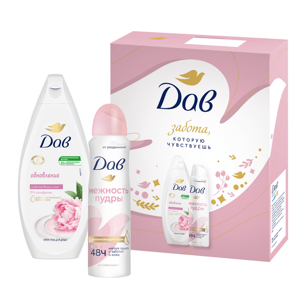 ПН Дав обновление крем гель для душа 250 мл дезодорант антиперспирант 150 млПодарочный набор для женщин Дав Обновление создан для деликатного и эффективного ухода за кожей тела. В наборе вы найдете два средства, необходимых для ежедневного ритуала красоты: крем-гель для душа увлажняющий и дезодорант-антиперспирант женский спрей от пота и запаха. Благодаря стильной упаковке этот косметический комплект станет идеальным подарком для близких девушек и женщин. Гель для душа женский увлажняющий разработан на основе 93% биоразлагаемой формулы* с сывороткой тройного увлажнения. Средство бережно относится к микробиому кожи, обеспечивает восстановление и смягчение кожи всего за 1 применение. Крем-гель для душа женский не содержит в составе сульфатов и (лаурет/лаурилсульфат натрия). Имеет плотную текстуру, отлично пенится и бережно очищает кожу. Дезодорант женский спрей эффективно защищает от пота и запаха в течение 48 часов**. Средство на ¼ состоит из увлажняющего крема, обогащено витаминами E и ' для увлажнения и предотвращения сухости кожи подмышек. Антиперспирант женский спрей помогает успокоить поврежденную поверхность кожи, устранить раздражение и покраснения после процедур эпиляции и депиляции. Не содержит этилового спирта в составе. Крем-гель для тела и дезодорант-антиперспирант для женщин имеют цветочный аромат с нотками пиона – воплощение женственности и изящества, где каждый аккорд звучит в идеальной гармонии, создавая образ утонченной, элегантной женщины. Средства дерматологически протестированы и подходят для ежедневного применения.