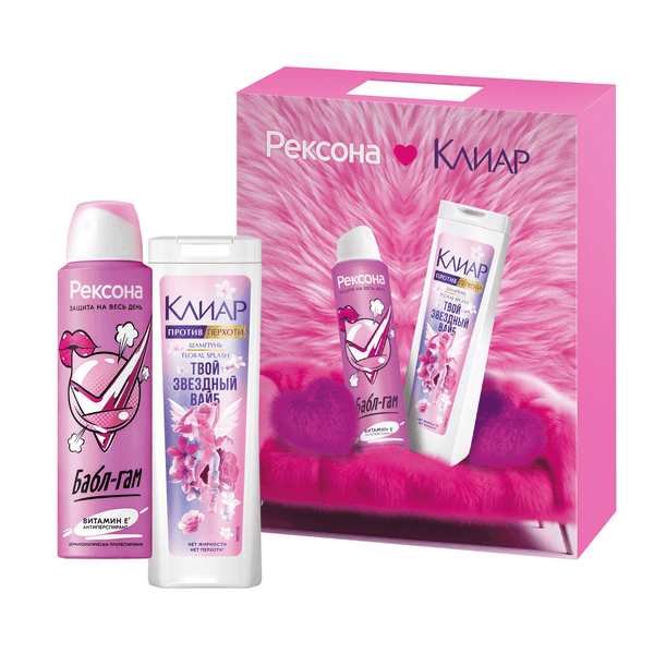 ПН Рексона Клиар дезодорант антиперспирант 150 мл шампунь 200 млРексона + Клиар Подарочный набор уходовой косметики для женщин – это отличный выбор для презента на любой праздник и просто так. В комплект входят два эффективных продукта: шампунь для жирных волос от перхоти и дезодорант-антиперспирант женский спрей. Шампунь против перхоти женский дает пышную пену и эффективно очищает волосы и кожу головы, не пересушивая их. В состав продукта входит пироктон оламин, который оказывает антибактериальный эффект и обеспечивает до 100% защиты от перхоти'. Шампунь для подростков-девочек обогащен экстрактом розы, который, в сочетании с другими активными компонентами, преображает локоны, делая их более гладкими и красивыми. Очищающий шампунь для волос Клиар – это оптимальное решение для жирных у корней локонов и кожи, склонной к образованию перхоти. Шампунь от жирных волос у корней вернет локонам свежий и ухоженный вид, чтобы вы наслаждались своей прической и чувствовали себя уверенно! Дезик женский спрей Рексона Бабл-гам обеспечивает надежную защиту от запаха и пота на 48 часов*. Аэрозольный женский дезодорант содержит витамин E**, оказывает увлажняющий эффект на кожу подмышек. Дезодорант-аэрозоль имеет приятный запах бабл-гам, созданный для тех, кто играет по своим правилам. Средство не оставляет следов на одежде, способствует восстановлению кожи подмышек. Рексона дезодорант идеально подойдет как для женщин, так и для девочек-подростков с 14 лет. Антиперспирант от запаха пота подмышек не содержит этиловый спирт, не имеет в составе парабенов и красителей. Дезодорант-спрей женский дерматологически протестирован и подходит для ежедневного применения. Подарочный набор для девушки Рексона + Клиар можно купить своей дочери, племяннице, сестре. Стильный бьюти бокс никого не оставит равнодушной. 'Удаляет видимую перхоть при регулярном использовании.