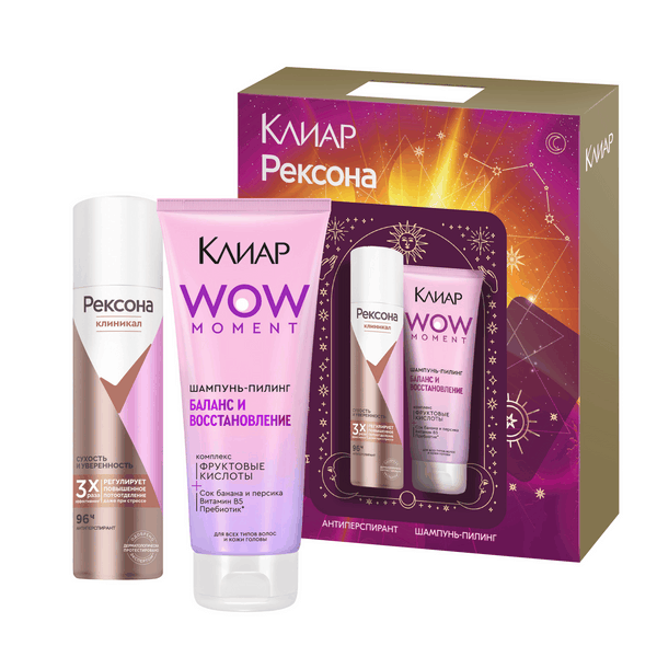 ПН Рексона Клиар дезодорант антиперспирант 150 мл шампунь пилинг 200 млРексона + Клиар Подарочный набор уходовой косметики для женщин – это отличный выбор для презента на любой праздник и просто так. В комплект входят два эффективных средства: шампунь-пилинг для кожи головы и дезодорант-антиперспирант женский спрей. Бьюти бокс для женщин подарочный (шампунь для волос женский 200 мл и дезодорант Рексона 150 мл) удобно взять с собой в дорогу, в поездку. Средство-пилинг для волос Клиар Баланс и восстановление глубоко* очищает кожу головы, удаляя себум, остатки стайлинга и сухого шампуня. Очищающий шампунь для волос содержит 2.7%' фруктовых кислот, которые способствуют обновлению клеток кожи*. В состав продукта входят также: витамин В5, пребиотик, сок банана и персика. Шампунь-пилинг для волос имеет приятный аромат ванили с нотками фруктов. Нанесите мини шампунь на влажные волосы и кожу головы, аккуратно помассируйте 2-3 минуты, затем тщательно смойте. Рексона дезодорант женский Клиникал Сухость и Уверенность обеспечивает надежную защиту от пота и неприятного запаха на протяжении 96 часов**. Разработанный с использованием микротехнологии совершенной защиты, он образует микропленку на поверхности кожи подмышек, обеспечивая ей максимальную*** защиту даже в экстремальных ситуациях (стресс, жара, спорт.) Дезик женский спрей быстро высыхает и не оставляет следов на одежде. Дезодорант-спрей женский от повышенного потоотделения имеет приятный цветочно-фруктовый аромат.