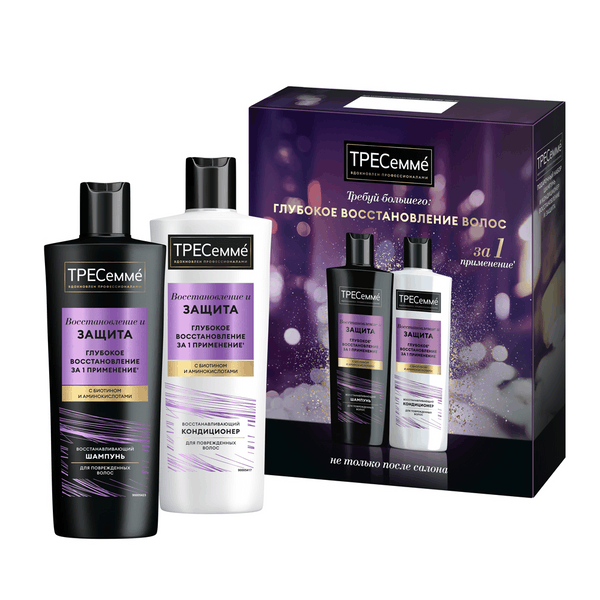 ПН ТРЕСеммé классика восстановления и защиты шампунь 230 мл кондиционер 230 млПодарочный набор для женщин ТРЕСеммé Глубокое восстановление и защита — это идеальный подарок для женщин и девушек, чьи волосы стали ослабленными и поврежденными из-за регулярных термических укладок и окрашиваний. В стильной подарочной упаковке содержатся базовые средства для ежедневного ухода за поврежденными локонами: шампунь для волос и кондиционер, которые обеспечивают глубокое’ восстановление и питание прядей. Особая* формула шампуня для волос и кондиционера из коллекции уходовых средств Восстановление и Защита, обогащенная биотином и аминокислотами, работает с каждым волосом, восстанавливает и питает его изнутри. Благодаря насыщенной формуле эти уходовые средства обеспечивают глубокое’ восстановление безжизненных и истонченных волос за 1 применение’’. Шампунь и кондиционер для поврежденных волос эффективно уменьшают ломкость и количество секущихся кончиков. Шампунь для волос женский восстанавливающий эффективно очищает кожу головы и волосы от избытка себума и загрязнений. Бальзам для волос женский преображает поврежденные локоны и наполняет их силой. Средства идеально подходят для ухода за поврежденными, окрашенными, осветленными и мелированными волосами.