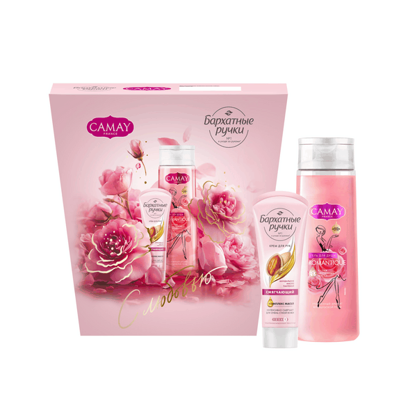 ПН Camay Бархатные ручки гель для душа парфюмированный 250 мл крем для рук 80 млCAMAY + Бархатные ручки Подарочный набор уходовой косметики для женщин — это отличный выбор для презента на любой праздник и просто так. Если вы не знаете, какой сюрприз преподнести своей знакомой, подруге или родственнице, то обязательно присмотритесь к этому набору уходовых средств. В комплект входят два эффективных продукта: гель для душа женский парфюмированный и крем для рук смягчающий. Парфюмированный гель для душа женский c ароматом, вдохновленным розами из знаменитого парка Багатель в Париже, пробудит в вас волшебное ощущение влюбленности. Вы почувствуете прохладу и свежесть зеленого яблока в верхних нотах аромата, переходящую в окутывающий, теплый, цветочно-медовый запах красных роз. А сладковато-древесные акценты кедра в качестве базовых нот аромата завершают нежное романтическое настроение. Гель для душа ароматизированный CAMAY имеет приятную текстуру и с легкостью превращается в нежную воздушную пену. Гель для душа парфюмированный женский бережно очищает и смягчает кожу, помогает сохранить ее естественную увлажненность. Крем для рук увлажняющий и питательный Бархатные ручки разработан на основе формулы с миндальным маслом и пантенолом. Питательный и увлажняющий крем для рук создан специально для смягчения огрубевших участков кожи. Средство устраняет ощущение сухости и стянутости. Крем для сухой кожи рук быстро впитывается, не оставляя липкости и жирной пленки. Крем для рук для очень сухой кожи имеет приятный аромат белых цветов с теплым гвоздичным пудрово-восточным шлейфом.