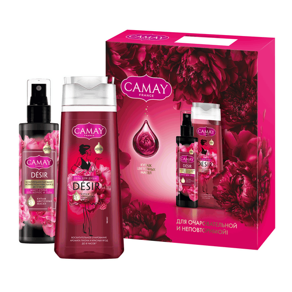 ПН Camay гель для душа 250 мл спрей мист для тела и волос женский парфюмированный 190 млCAMAY Подарочный набор уходовой косметики для женщин — это отличный выбор для презента на любой праздник и просто так. Если вы не знаете, какой сюрприз преподнести своей знакомой, подруге или родственнице, то обязательно присмотритесь к этому набору уходовых средств. В комплект входят два эффективных продукта: гель для душа и спрей-мист для тела и волос парфюмированный. Camay гель для душа женский парфюмированный ВОСХИТИТЕЛЬНОЕ ОЧАРОВАНИЕ имеет состав, обогащенный цветочными маслами: лаванды, иланг-иланга и душицы. Камей гель для душа ароматизированный имеет стойкий аромат пиона и красных ягод, который сохраняется на коже до 8 часов*. Наши эксперты вдохновились феноменально** популярным парфюмом 540. Так появился парфюмированный женский гель для душа Камей. Пион, османтус и фрезия представляют собой верхние ноты парфюма, плавно переходящие в сердце композиции – сочные красные ягоды (вишня и клубника). Завершающие акценты обволакивающего кашемира и белого кедра стали шлейфом, послевкусием данного аромата. Спрей-мист для волос и тела парфюмированный имеет приятный аромат пиона, клубники и вишни, который сохраняется на коже до 12 часов***.