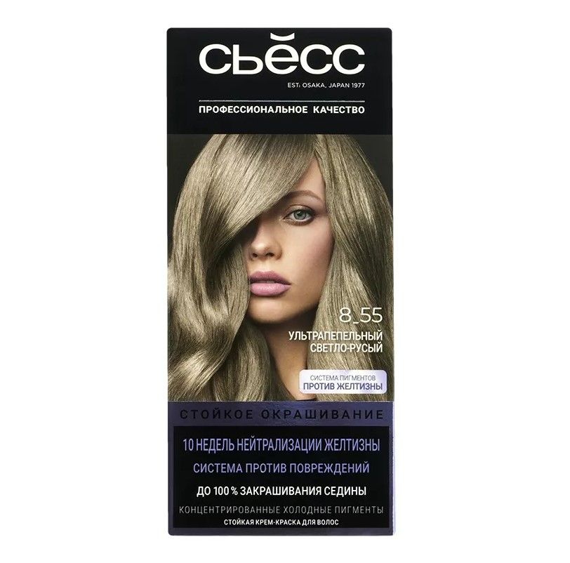 Сьёсс краска для волос 8-55 ультрапепельный светло русыйНовая Ультрапепельная коллекция стойких крем-красок СЬĔСС содержит комплекс концентрированных холодных и пепельных пигментов, которые глубоко проникают внутрь волоса, обеспечивая 10 недель нейтрализации желтизны и холодный тон как после салона.Ухаживающая технология восстанавливает повреждённые связи в структуре волоса. Формула с кератином покрывает кутикулу волос, делая волосы более мягкими и гладкими. Результат: заметное улучшение качества волос и снижение ломкости волос до 80%*.