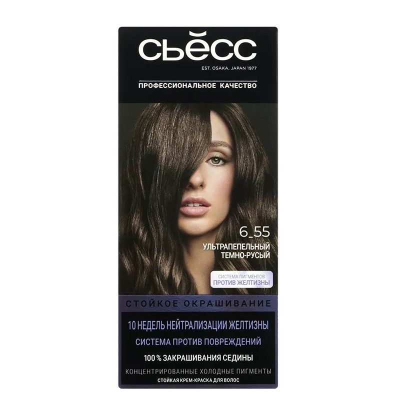 Сьёсс краска для волос 6-55 ультрапепельный темно русыйНовая Ультрапепельная коллекция стойких крем-красок СЬĔСС содержит комплекс концентрированных холодных и пепельных пигментов, которые глубоко проникают внутрь волоса, обеспечивая 10 недель нейтрализации желтизны и холодный тон как после салона.Ухаживающая PLEX-технология восстанавливает повреждённые связи в структуре волоса. Формула с кератином покрывает кутикулу волос, делая волосы более мягкими и гладкими. Результат: заметное улучшение качества волос и снижение ломкости волос до 80%*.