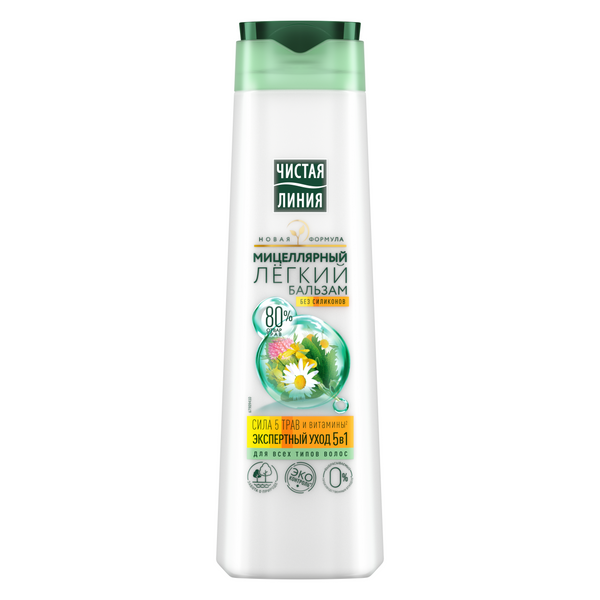 Чистая Линия бальзам для волос легкий мицеллярный экспертный уход 5в1 без силиконов 380 млШампуни и Бальзамы ЧИСТАЯ ЛИНИЯ со знаком ЭКОконтроль гарантируют экологическую чистоту и пользу входящих трав. Травы в составе продуктов ЧИСТАЯ ЛИНИЯ имеют паспорт качества и проходят многоступенчатый контроль экологической чистоты. ЧИСТАЯ ЛИНИЯ гарантирует эффективность: следит за соблюдением уровня активных веществ, использует только самые эффективные части растений, занимается клиническими исследованиями отвара трав. Эксперты Института Чистая линия создали коллекцию инновационных средств по уходу за волосами на мицеллярной основе. Они не раздражают чувствительную кожу головы, сохраняют ее гидролипидный баланс и не пересушивают волосы, даже при ежедневном мытье. Мицеллярный бальзам Экспертный уход 5в1 создан для невесомого ухода за волосами. Мицеллярная основа бережно смягчает волосы, полезная формула 80% отвара трав наполняет волосы силой, ФИТОвитамины придают блеск и мягкость. Без утяжеления волос. Подходит для всех типов волос.