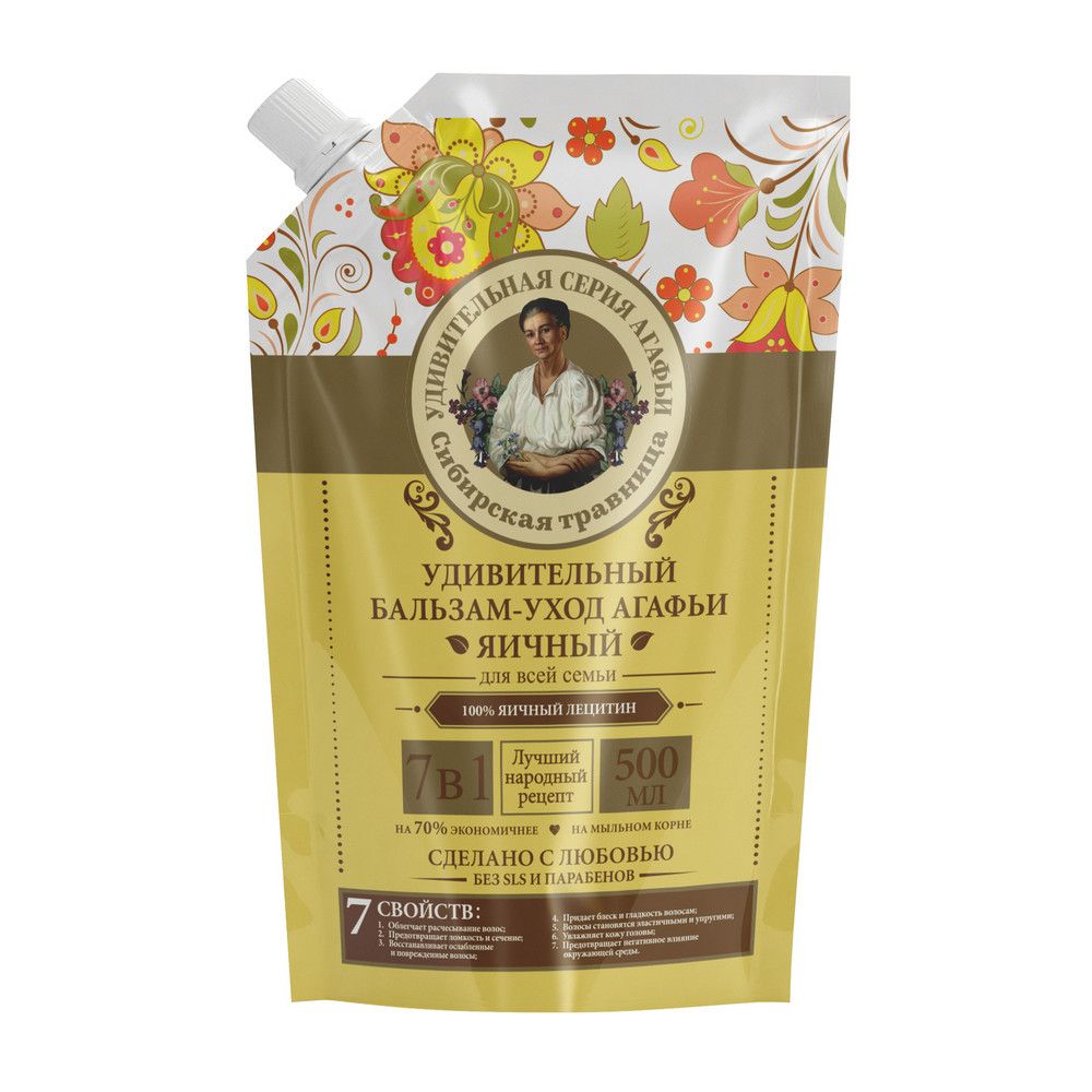 Удивительная Серия Агафьи бальзам уход яичный 500 мл дой пакУдивительно: яйцо можно использовать как шампунь и как кондиционер. Яичный желток, соединенный с водой, хорошо пенится и обладает прекрасными моющими свойствами. Для волос это двойная польза.