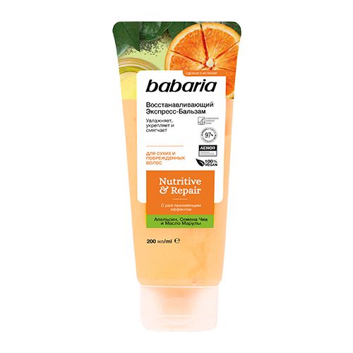 Babaria восстанавливающий экспресс бальзам для волос 200 млВосстанавливающий экспресс бальзам для волос Babaria с разглаживающим эффектом. Средство смягчает волосы, облегчает укладку и расчесывание. В основе состава натуральные, питательные ингредиенты. Экстракт испанского апельсина дарит локонам силу, упругость, стимулирует кровообращение и оказывает себорегулирующее действие на кожу головы. Семена чиа интенсивно питают полезными веществами. Масло марулы восстанавливает поврежденную структуру прядей, защищает их от воздействий окружающей среды, увлажняет.
