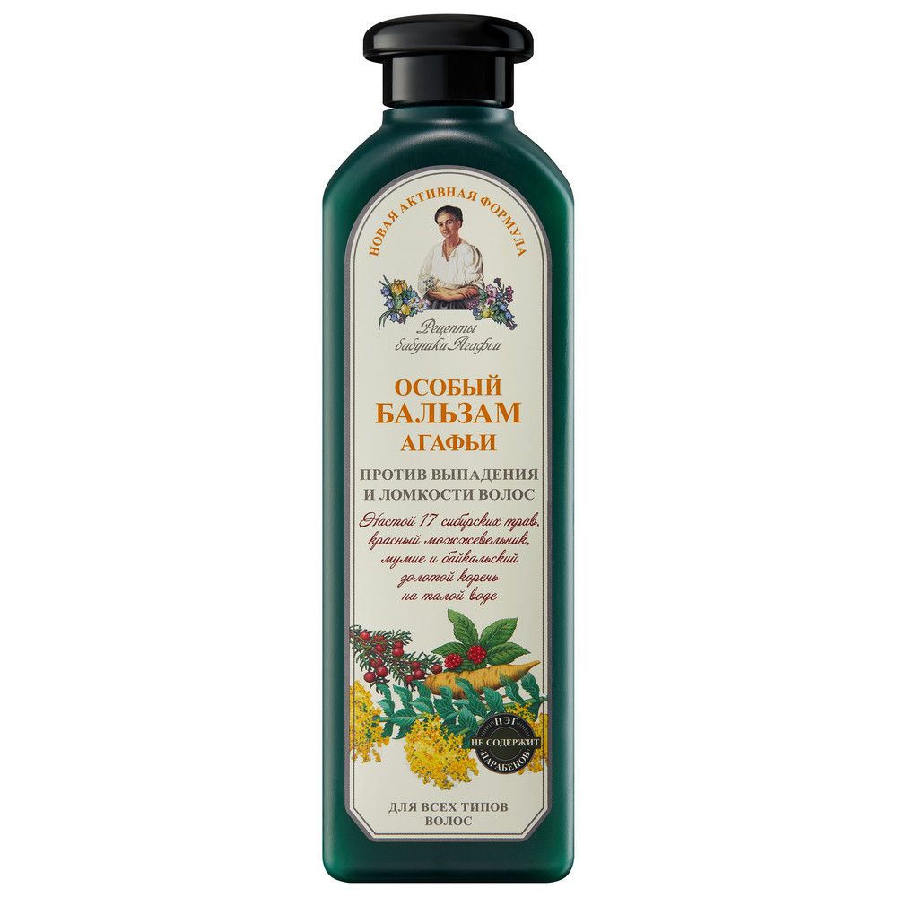 Рецепты Бабушки Агафьи бальзам для волос против выпадения и ломкости особый 350 млСодержание в бальзаме талой воды обеспечивает кондиционирование волос, а в сочетании с удивительными по своим природным свойствам компонентами – горным бальзамом (мумие), байкальским золотым корнем и красным можжевельником - спасет волосы от выпадения, придаст им прочность и обеспечит здоровый рост.