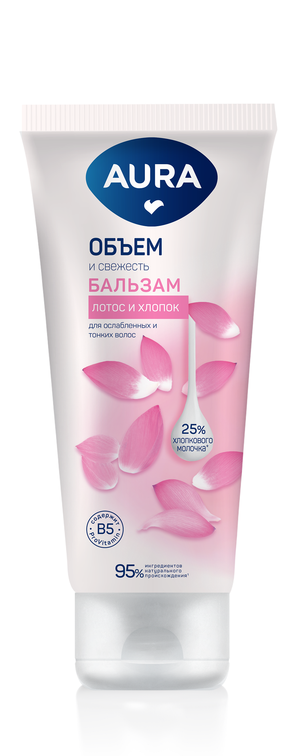Aura бальзам для волос объём и свежесть туба флиптоп 250 млБальзам AURA Объем и свежесть специально разработан для ухода за ослабленными и тонкими волосами. Выравнивает структуру волос, делает их блестящими и шелковистыми, облегчает расчесывание. Глубоко проникает в структуру волос, интенсивно ухаживает, придает невероятный блеск и свежесть волосам без утяжеления. ЭКСТРАКТ ЛОТОСА придает волосам жизненный тонус, объем и сияние, а также предотвращает сухость и ломкость волос, эффективен против секущихся кончиков. ПРОВИТАМИН В5 восстанавливает поврежденную структуру волос, глубоко питает и разглаживает их по всей длине. ХЛОПКОВОЕ МОЛОЧКО легко проникает в структуру волос, нежно ухаживает за ними и придает особую мягкость и блеск. Бальзам на 95% состоит из ингредиентов натурального происхождения. Благодаря АКТИВНОЙ ФОРМУЛЕ ТРОЙНОГО УХОДА волосы приобретают невероятный объем и свежесть при его регулярном использовании. Для наилучшего эффекта рекомендуем использовать вместе с шампунем AURA Объем и свежесть.