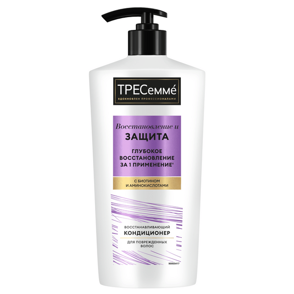 ТРЕСеммé восстановление и защита кондиционер для волос восстанавливающий 630 млTRESemmé Repair & Protect — кондиционер для волос восстанавливающий, обогащенный биотином. Бальзам для волос, вдохновленный профессиональными уходовыми средствами, оказывает скорую SOS-помощь для безжизненных локонов и дарит видимый результат: ультравосстановление и питание всего за одно применение’! Верните волосам красоту и блеск вместе с кондиционером для волос женским TRESemmé Repair & Protect: - Бальзам ополаскиватель для волос заметно преображает поврежденные локоны всего за одно применение’ и наполняет их силой. - Особая формула’’ с биотином работает с каждым волосом, восстанавливая и питая изнутри. - Средство значительно сокращает количество секущихся кончиков’ и делает волосы более ухоженными. - Кондиционер с кремовой текстурой легко наносится и распределяется по длине, обволакивая каждый волос, а приятный аромат делает уход за собой еще приятнее. Кондиционер идеально подойдет для поврежденных волос, которые стали ломкими и секущимися из-за горячих укладок и окрашивания. Средство также можно использовать для дополнительного питания и восстановления волос, которые выглядят здоровыми, но нуждаются в качественном уходе и поддержке.