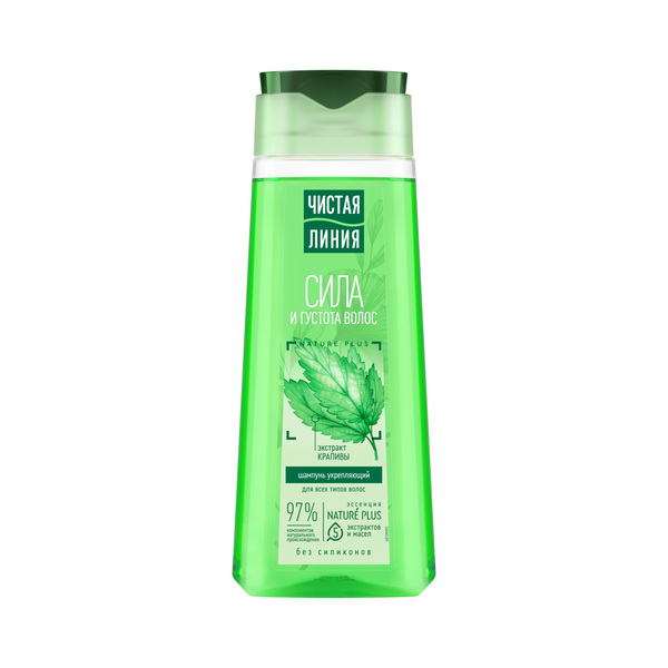 Чистая Линия шампунь укрепляющий сила и густота для всех типов волос с экстрактом крапивы без силиконов 250 млВстречайте любимый шампунь с усиленной формулой1 и в обновленном дизайне! Эксперты бренда Чистая Линия разработали укрепляющий шампунь на отваре целебных трав Крапива, который на 97% состоит из компонентов натурального происхождения и подходит для всех типов волос. Эссенция 5 Nature Plus – НЕЙЧЕ ПЛЮС из 5-и из тщательно отобранных по своим свойствам экстрактов и масел, предупреждает выпадение, питает и защищает волосы от повреждений. - Экстракт вербены обладает успокаивающим, общеукрепляющим действием. - Шалфей способствует питанию кожи головы, укреплению и росту волос*. - Экстракт шиповника, богатый витаминами и известный своими восстанавливающими свойствами, стимулирует рост волос*. - Масло льна питает, смягчает кожу и волосы. - Миндальное масло восстанавливает секрецию и придает здоровый блеск. - Листья крапивы, насыщенные витаминами, укрепляют корни волос и способствуют росту. Свойства шампуня подтверждены потребительским тестированием2. - 89% респондентов отметили, что после применения шампуня волосы на ощупь стали более густыми и плотными; - 78% – менее ломкими; - 75% – шампунь наполняет волосы силой по всей длине. Результат – естественно красивые, густые и крепкие волосы.