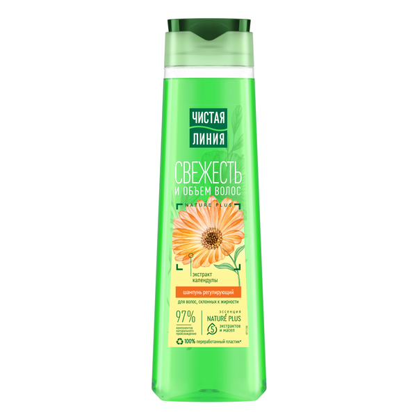 Чистая Линия шампунь для волос склонных к жирности календула 400 млНовая формула шампуней ЧИСТАЯ ЛИНИЯ создана для видимой СИЛЫ и ГУСТОТЫ волос. Технология биоферментации делает привычные натуральные компоненты до 60 раз эффективнее. Волосы становятся плотнее и гуще по всей длине. Шампунь Регулирующий для волос, склонных к жирности с экстрактами календулы, шалфея, тысячелистника, контролирует активность сальных желез и надолго сохраняет ощущение свежести и чистоты. Активные натуральные компоненты снижают излишнюю жирность кожи головы и волос, не пересушивая корни. В календуле содержатся каротиноиды, флавоноиды (биологически активные вещества, обладающие антиоксидантными свойствами), кумарины и прочие полезные для кожи вещества. Благодаря им календула очищает, освежает, тонизирует. Шампуни и бальзамы с добавлением шалфея питают кожу головы и волосы, а также нормализуют их состояние. Регулярное применение косметических средств на основе тысячелистника помогает вернуть волосам природную мягкость и объем.