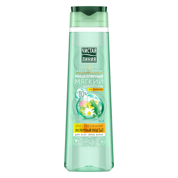 Чистая Линия фитотерапия мицеллярный мягкий шампунь экспертный уход 5в1 400 млШампуни и Бальзамы ЧИСТАЯ ЛИНИЯ со знаком ЭКОконтроль гарантируют экологическую чистоту и пользу входящих трав. Травы в составе продуктов ЧИСТАЯ ЛИНИЯ имеют паспорт качества и проходят многоступенчатый контроль экологической чистоты. ЧИСТАЯ ЛИНИЯ гарантирует эффективность: следит за соблюдением уровня активных веществ, использует только самые эффективные части растений, занимается клиническими исследованиями отвара трав. Эксперты Института Чистая линия создали коллекцию инновационных средств по уходу за волосами на мицеллярной основе. Они не раздражают чувствительную кожу головы, сохраняют ее гидролипидный баланс и не пересушивают волосы, даже при ежедневном мытье. Мицеллярный шампунь создан для мягкого очищения волос без сухости, 5 действий в 1 шампуне. Мицеллярная основа бережно очищает и увлажняет волосы, не повреждая даже истонченные кончики длинных волос, полезная формула 80% отвара трав наполняет волосы силой, ФИТОвитамины придают блеск и мягкость Подходит для всех типов волос.
