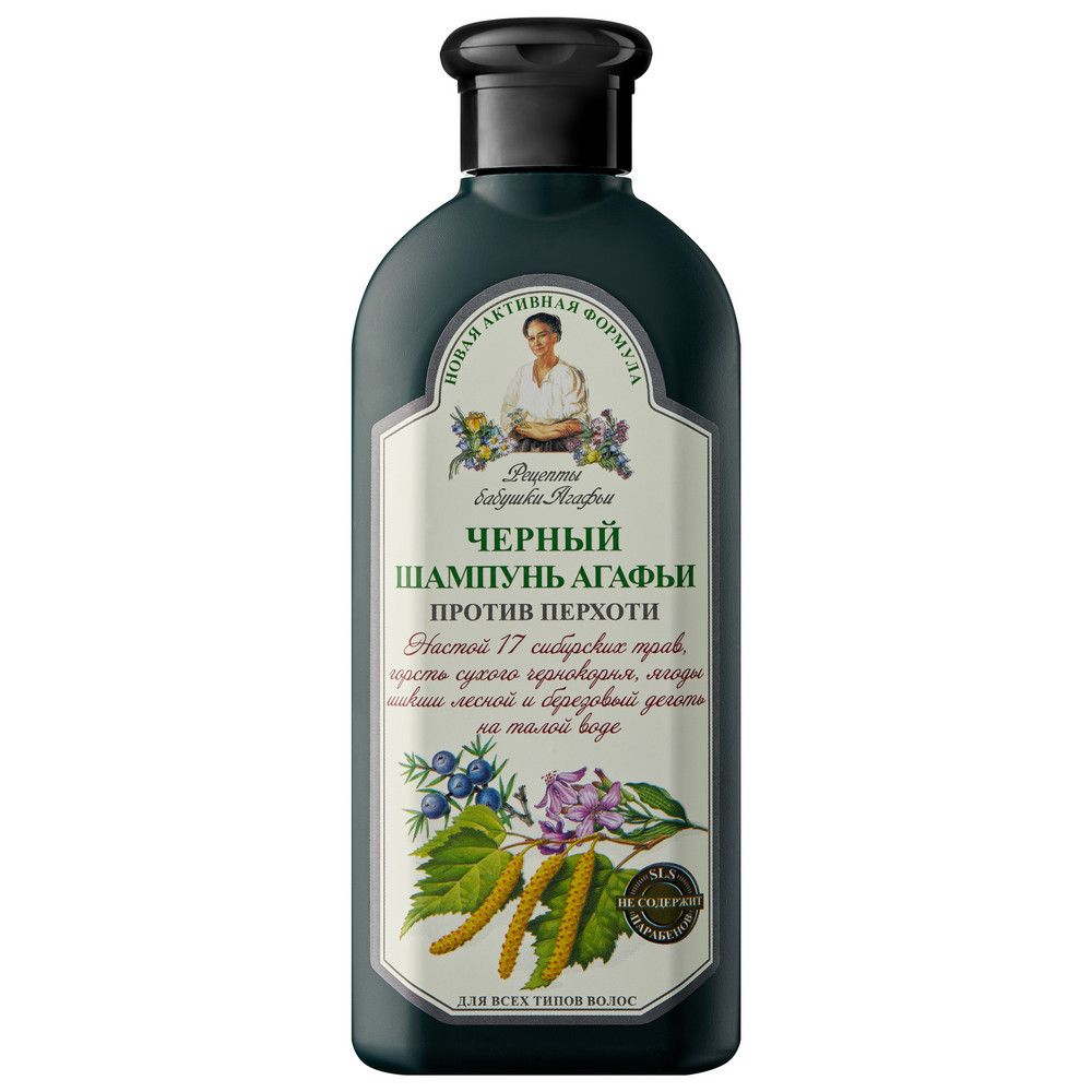 Рецепты Бабушки Агафьи шампунь для всех типов волос черный 350 млЧерный шампунь Агафьи против перхоти создан на настое 17 сибирских трав и сухого чернокорня на талой воде с добавлением ягоды шикши лесной и березового дегтя. Березовый деготь славится своим чудным действием на кожу головы, предотвращая появление перхоти. Чернокорень улучшает кровообращение, а шикша питает волосы. Настой трав сибирских на талой воде успокоит кожу головы, избавит от перхоти и укрепит волосы.