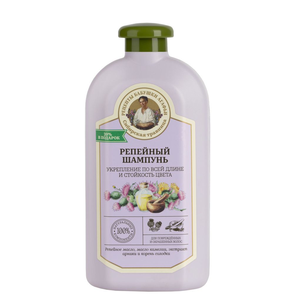 Сибирская Травница шампунь для поврежденных и окрашенных волос репейный 500 млШампунь для поврежденных и окрашенных волос РЕЦЕПТЫ БАБУШКИ АГАФЬИ Сибирская Травница Укрепление по всей длине специально создан для помощи поврежденным и окрашенным волосам. Репейное масло препятствует вымыванию пигмента из окрашенных локонов и способствует укреплению структуры. Если волосы повреждены, то без него точно не обойтись – витамины и жирные кислоты репейного масла помогут коже головы и восстановят ослабленные корни волос. Масло камелии вернет им гладкость и блеск, экстракт арники оздоровит и защитит, а корень солодки очистит и ускорит рост. Шампуню репейному удастся вернуть силу и блеск поврежденным волосам, а окрашенным помочь выглядеть здоровыми, гладкими.