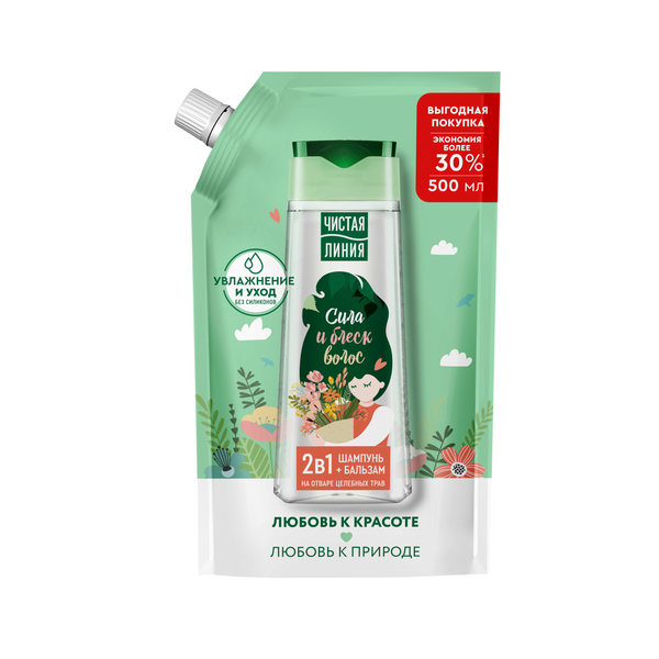 Чистая Линия шампунь бальзам 2в1 сила и блеск волос на отваре целебных трав без силиконов 500 млШампунь Чистая Линия 2 в 1 на отваре целебных трав – это очищение и питание волос в одном уходе без силиконов. Шампунь бережно очищает кожу головы и предупреждает выпадение волос2, а бальзам смягчает волосы и облегчает расчесывание, придавая блеск. Формула продукта содержит 97% компонентов натурального происхождения, в том числе Nature PLUS – НЕЙЧЕ ПЛЮС 5 экстрактов и масел (экстракт вербены, экстракт шалфея, экстракт шиповника, масло миндаля и льна). Активные натуральные компоненты предупреждают выпадение2, питают и защищают волосы от повреждений. Экстракт вербены обладает успокаивающим, общеукрепляющим действием. Шалфей способствует питанию кожи головы, укреплению и росту волос*. Экстракт шиповника, богатый витаминами и известный своими восстанавливающими свойствами, стимулирует рост волос*. Масло льна питает, смягчает кожу и волосы. Миндальное масло способствует нормализации секреции и придает здоровый блеск. Экстракт хмеля и репейное масло питают корни волос, способствуя их росту