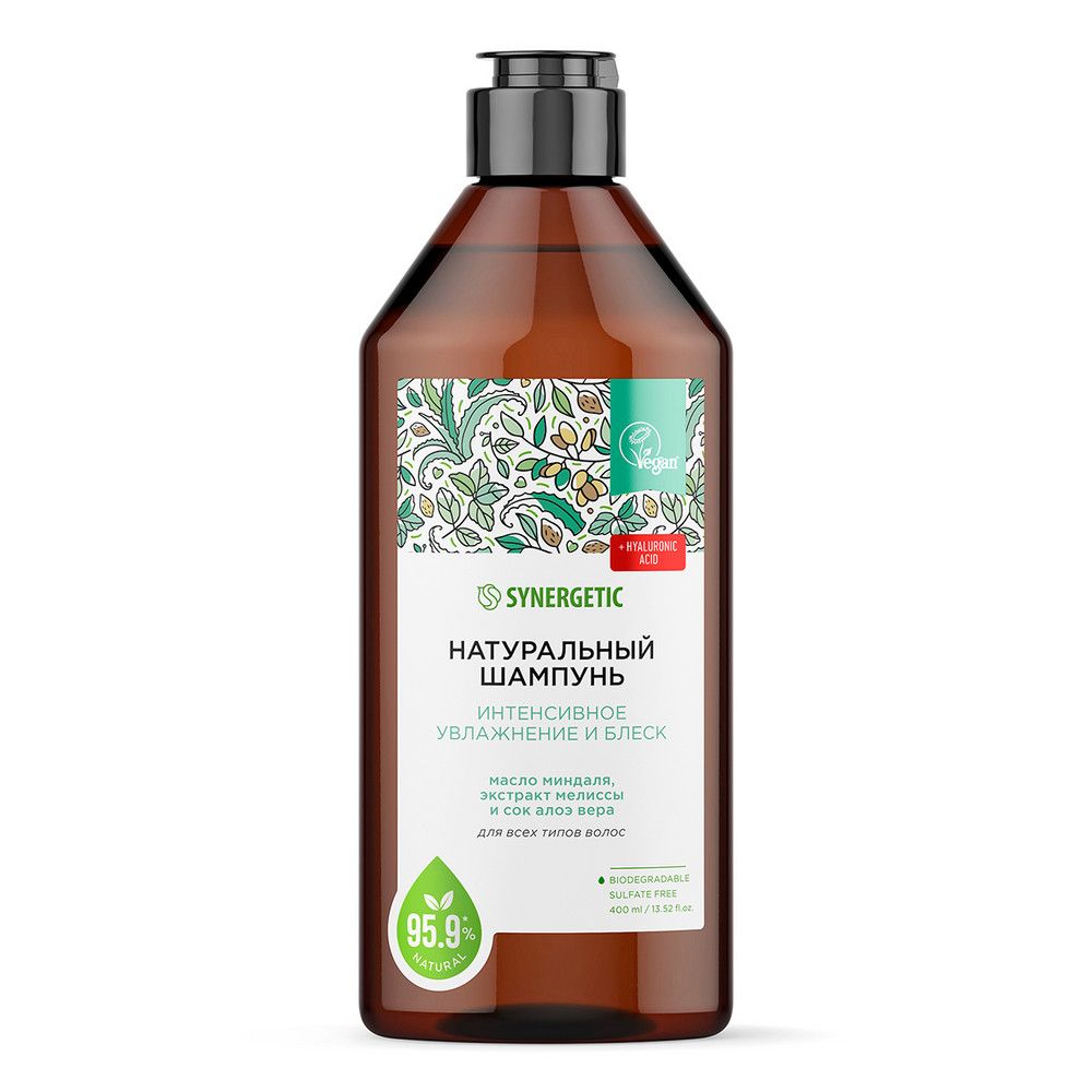 Synergetic натуральный бессульфатный шампунь интенсивное увлажнение и блеск 400 млНатуральный бессульфатный шампунь SYNERGETIC "Интенсивное увлажнение и блеск" - эффективное средство для очищения кожи головы и волос. Бессульфатный шампунь обеспечивает деликатное очищение, эффективный уход за волосами и защиту кожу головы. Формула с гиалуроновой кислотой оказывает комплексное воздействие, эффективно увлажняет волосы и придает им здоровое сияние, не утяжеляя их. Комплекс масел миндаля, арганы и конопли питает, смягчает и увлажняет. Инновационные компоненты шампуня укрепляют волосы и стимулируют восстановление кератиновых волокон. Сок алоэ вера и экстракт мелиссы придают волосам эластичность и блеск. Мультифункциональный компонент натурального происхождения софоролипид мягко очищает кожу головы и сохраняет естественный микробиом. Инновационный увлажняющий комплекс усиливает барьерные свойства кожи и обеспечивает до 72 часов глубокого увлажнения. Физиологичный уровень pH 5,5 устраняет сухость кожи головы и гарантирует безопасность при частом использовании средства даже для чувствительной кожи. Натуральный шампунь не содержит SLS, SLES, силиконов, минеральных масел и красителей, а также компонентов животного происхождения, не тестируется на животных и сертифицирован британской организацией The Vegan Society. Знак Vegan - мировой стандарт этичной продукции. Биоразлагаемые компоненты шампуня безопасны для природы и человека и не наносят вред микрофлоре септических установок.