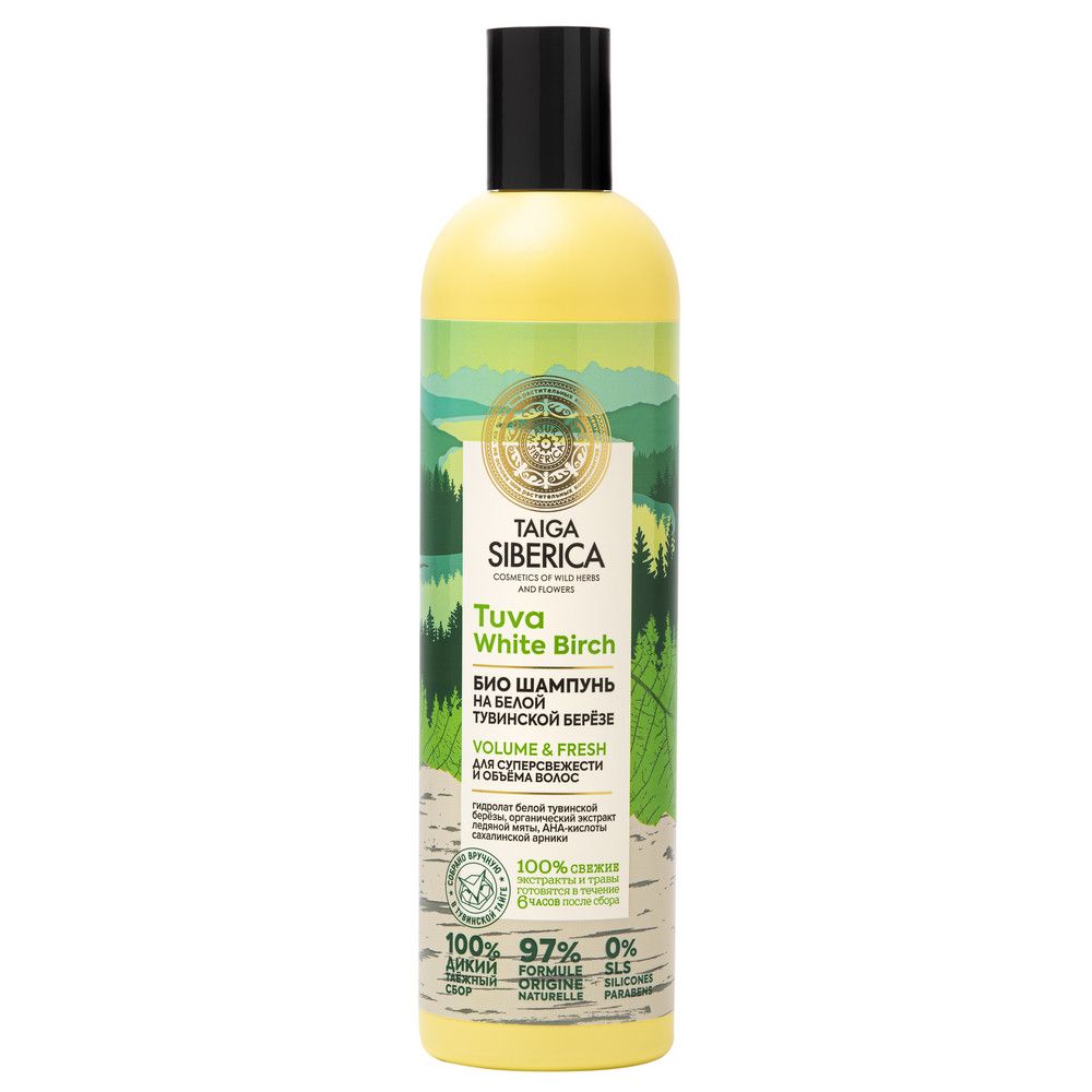 Taiga Siberica шампунь для супер свежести и объема волос освежающий био 400 млБио шампунь для супер свежести и объёма волос VOLUME & FRESH Tuva White Birch Идеальное сочетание свежести и легкости. Благодаря восстановлению оптимального баланса кожи головы и отсутствию в составе силиконов, волосы у корней сохраняют силу и упругий объем. Супер объем без утяжеления Наполняет свежестью и легкостью Укрепляет тонкие и ослабленные волосы БЕЛАЯ БЕРЕЗА — ТАЕЖНЫЙ СУПЕРФУД ДЛЯ ВОЛОС. Гидролат белой тувинской березы на 85% состоит из бетулиновой кислоты – таежного суперфуда и антиоксиданта для волос. В дикой ледяной мяте содержание эфирного масла до 5 раз выше, чем в обычной. Эффективно тонизирует и освежает кожу головы, придает волосам здоровый блеск и силу.AHA – кислоты сахалинской арники обновляют и оздоравливают кожу головы, способствуя укреплению корней и росту новых волос.