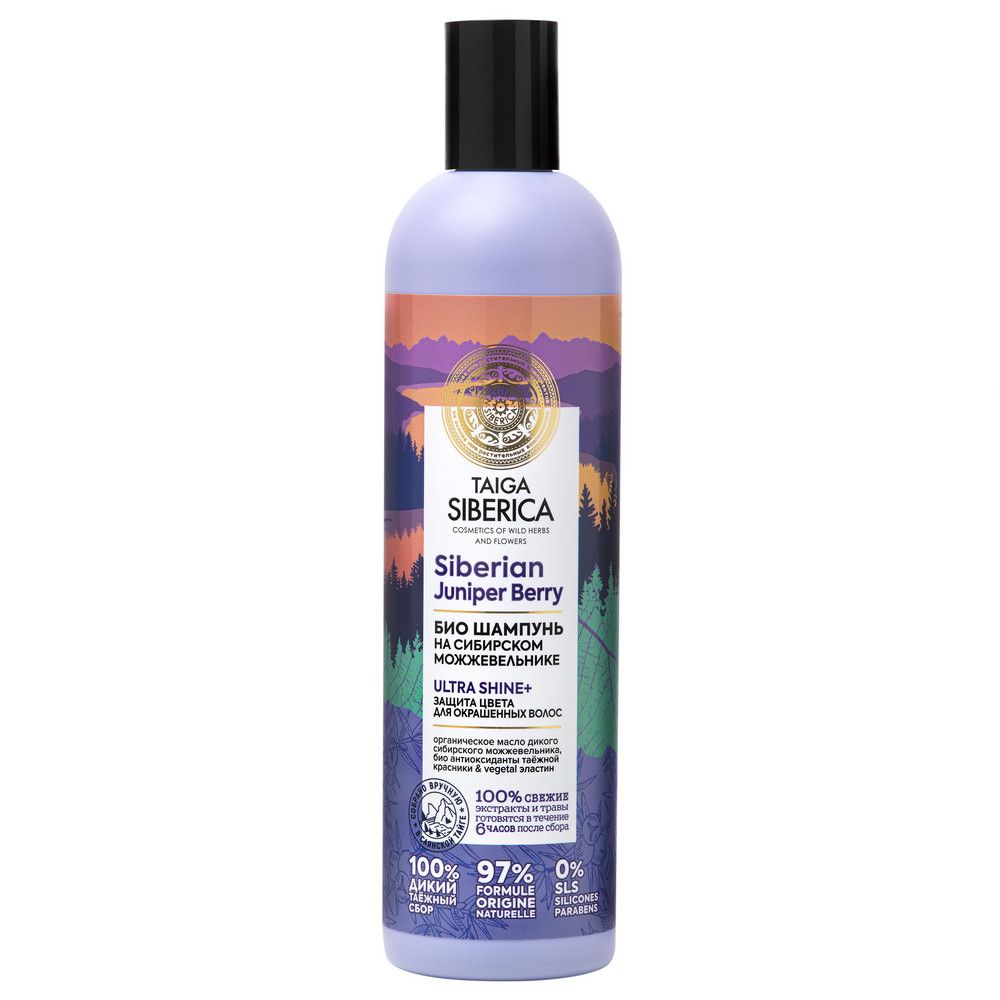 Taiga Siberica шампунь био защита цвета для окрашенных волос 400 млБио шампунь защита цвета для окрашенных волос ULTRA SHINE+ Siberian Juniper Berry Интенсивно увлажняет тусклые в результате окрашивания волосы, возвращает им роскошный сияющий блеск. Надолго сохраняет яркость и насыщенность цвета, препятствуя вымыванию пигмента. Облегчает расчесывание Защищает от негативных воздействий окружающей среды Эффект натурального ламинирования ДИКИЙ СИБИРСКИЙ МОЖЖЕВЕЛЬНИК — ДРЕВНЕЕ И МИСТИЧЕСКОЕ РАСТЕНИЕ ТАЙГИ. Органическое масло дикого сибирского можжевельника содержит максимум AHA-кислот и витамина С, усиливающих яркость цвета и блеск. Высокое содержание воска и смол создает эффект биоламинирования, обволакивая и восстанавливая структуру волос. Таежная красника богата антиоксидантами, эффективно тонизирует, укрепляет и возвращает жизненные силы волосам после окрашивания, а также защищает от воздействия окружающей среды. Vegetal эластин содержит необходимые волосам аминокислоты, делает волосы более упругими, эластичными и послушными.