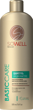 Sowell шампунь ежедневный для всех типов волос basic carе базовый уход 500 млШампунь SoWell Basic Care – идеальный выбор для тех, кто привык ежедневно мыть голову.Шампунь с мощной увлажняющей формулой мягко и эффективно очищает кожу головы и волосы, придаёт ощущение свежести и легкости после мытья. Улучшает состояние волос, предотвращает сухость и раздражение, улучшает эластичность и послушность волос, повышает их сопротивляемость повреждениям, сокращает ломкость.Содержит супер увлажняющий комплекс, Hydro Smart Technology, правильно подобранные компоненты и пропорции которого обеспечивают настоящую интеллектуальную защиту от обезвоживания и укрепление структуры волос всех типов, а также поддерживают гидролипиный баланс кожи головы.Комплекс Hydro Smart Technology содержит гиалуроновую кислоту, алоэ вера, витамины и пантенол.