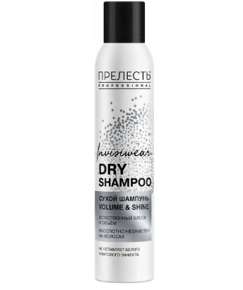Прелесть professional invisiwear сухой шампунь для волос объем и блеск 200 млСредство для очищения волос, ежедневного стайлинга, и увеличения объема Сухой шампунь Прелесть Professional Объем и сияние, подходит для женщин, мужчин, подростков. С его помощью можно за 5 минут привести волосы в порядок, убрав жирный блеск с волос и головы. Сухой шампунь полностью вычесывается, не оставляет белых следов на одежде и волосах. После его применения прическа сохраняет свежесть и объем до 24 часов. Шампунь сухой обладает легким стайлинг эффектом и помогает увеличить объем чистых или не совсем свежих волос и облегчить процесс ежедневной укладки, делая локоны мягкими и послушными. Его можно применять ежедневно после мытья шампунем и бальзамом, кондиционером для волос, сухой шампунь легко смывается и не требует дополнительных средств. Ухаживающие компоненты в его составе бережно относятся к волосам, надолго сохраняя их свежесть. Благодаря применению средства для ухода за волосами можно уменьшить интервалы между мытьем головы.