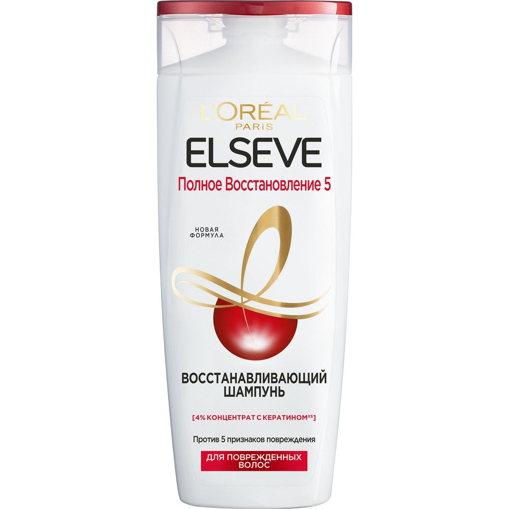Elseve шампунь для волос полное восстановление 5 для поврежденных волос 250 млУ Вас сильно поврежденные волосы? Подарите им интенсивное восстановление. Наш шампунь, обогащенный 4% восстанавливающим концентратом с КЕРАТИНОМ, мгновенно преображает даже очень поврежденные волосы*. **5 ЭФФЕКТОВ ДЛЯ ПОВРЕЖДЕННЫХ ВОЛОС:** 1. ВОССТАНОВЛЕНИЕ СТРУКТУРЫ ВОЛОС; 2. УВЛАЖНЕНИЕ; 3. МЯГКОСТЬ; 4. ШЕЛКОВИСТОСТЬ; 5. ПРОЧНОСТЬ.