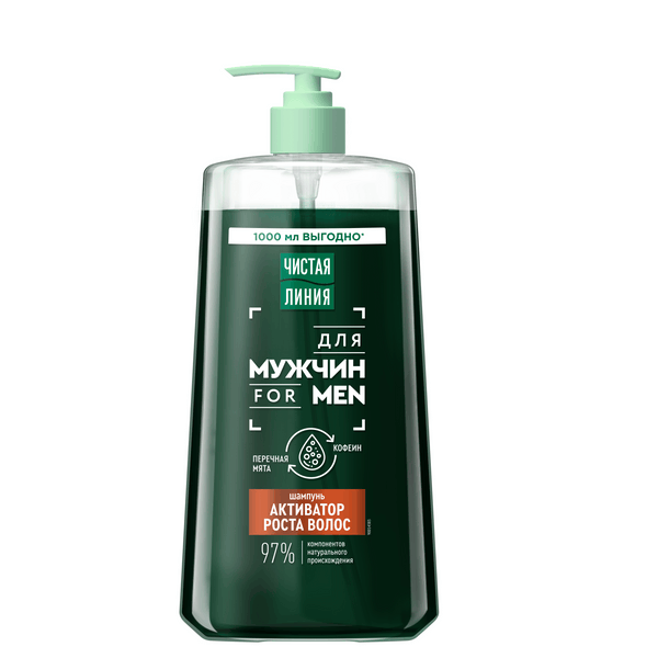 Чистая линия шампунь для мужчин для роста волос с перечной мятой и кофеином 1000 млШампунь мужской для волос Чистая линия ДЛЯ МУЖЧИН с перечной мятой и кофеином – это эффективное средство, которое обеспечивает вашим волосам и уходу за кожей головы. Мужской шампунь-активатор роста волос на 97% состоит из компонентов натурального происхождения. Шампунь питательный, изготовленный на основе указанной формулы с учетом особенностей мужских волос и кожи головы. Мужской шампунь для волос с мятой и кофеином не содержит силикона. Очищающий шампунь для волос с перечной мятой и кофеином в составе обеспечивает комплексный уход за локонами и волосами. Шампунь Чистая линия для мужчин с перечной мятой и кофеином стимулирует рост волос, делая пряди сильнее от корней до кончиков. Шампунь для укрепляющих волос дает видимый результат уже после первого применения: локоны становятся на 45% более сильными. Шампунь для мужчин Чистая линия не является лекарственным средством. Чистый шампунь мужской для роста волос 1000 мл – это выгодная* покупка. Шампунь-стимулятор роста волос Чистая линия ДЛЯ МУЖЧИН – это средство формирования больших волос, которого хватит надолго, что также Вам понравится