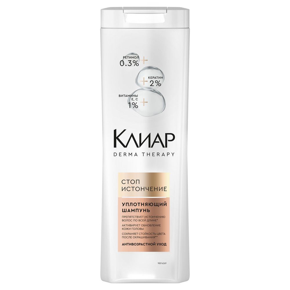 Этот продукт, разработанный в рамках системы ухода Клиар, помогает предотвратить истончение волос по всей длине*. Формула средства обогащена 0,3%' ретинола и 2% кератина', - ингредиентами, способствующими омоложению и обновлению кожи головы''.