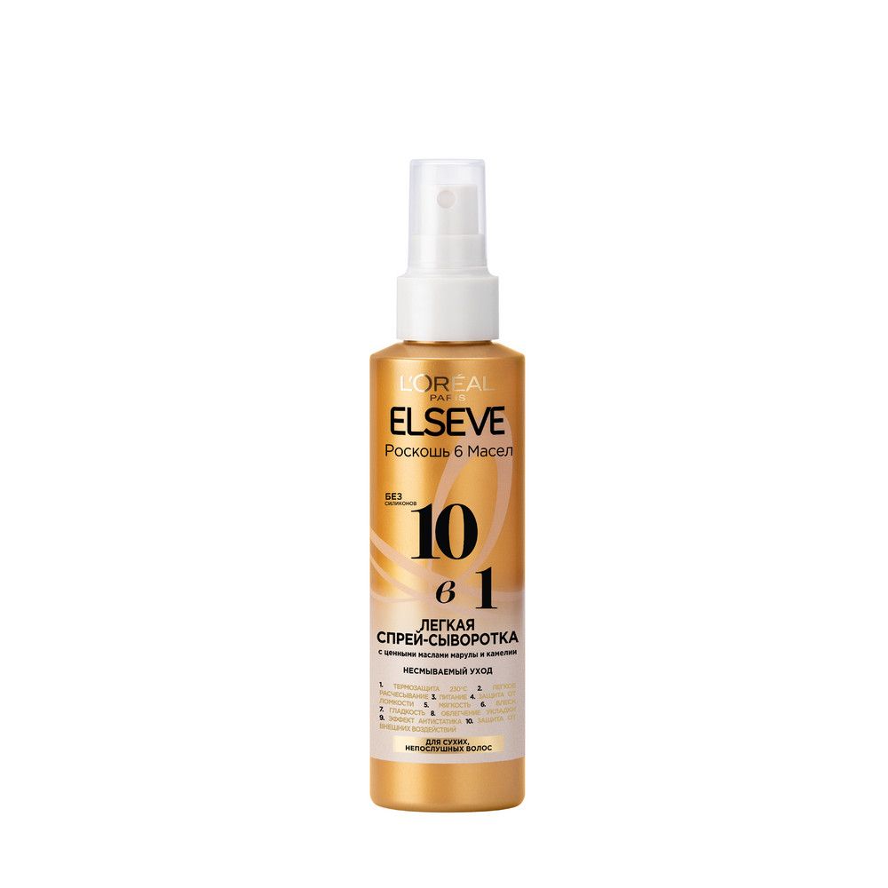 Elseve лёгкая спрей сыворотка для волос 10в1 с ценными маслами марулы и камелии без силиконов 150 млСыворотка Elseve для волос 6 масел 10 в 1, 150 мл – эффективное средство, которое защитит волосы от негативного воздействия окружающей среды, сделает локоны более послушными и мягкими, а пряди – гладкими и шелковистыми. В состав сыворотки входят ценные масла марулы и камелии. Благодаря этому средство питает и увлажняет волосы, обеспечивает легкое расчесывание, предотвращение возникновение секущихся концов, дает антистатический эффект. С такой сывороткой даже после частых укладок волосы будут выглядеть ухоженными и естественными, приобретут натуральный блеск и красивое сияние. К тому же укладку с таким средством сделать проще и быстрее. Сыворотка обладает легкой текстурой и выпускается в виде спрея. Она не утяжеляет локоны и не склеивает их. Наносить средство следует на влажные волосы – от корней до кончиков. Распределять ее можно пальцами или расческой. Смывать сыворотку после нанесения не нужно. При попадании в глаза незамедлительно промыть водой слизистые оболочки. Средство заключено в практичный флакон объемом 150 мл. За счет этого сыворотка всегда будет у вас под рукой, ведь она поместится даже в небольшую косметичку.